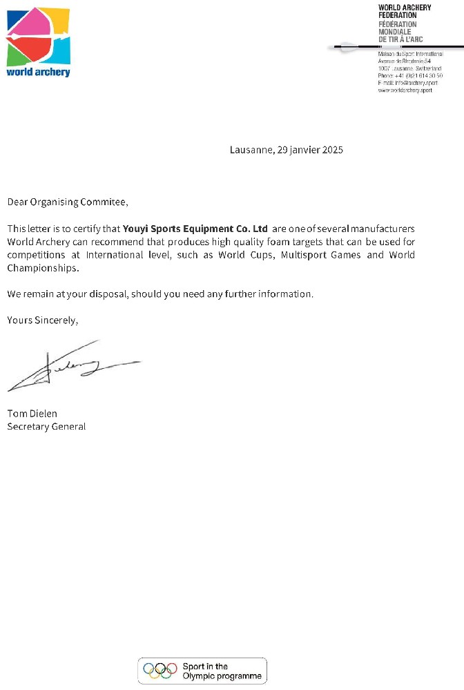 目前,主要生產(chǎn)和銷售射箭比賽及訓(xùn)練專用器材,包括:箭靶、靶紙、靶架、號碼牌、風(fēng)向旗、計時記分器等場地器材設(shè)備;反曲弓、復(fù)合弓、傳統(tǒng)弓、瞄準(zhǔn)器、防震桿等弓箭裝備;箭壺、護胸、護臂、護指等各類箱包護具。公司所生產(chǎn)的射箭器材已通過國際射箭聯(lián)合會及中國射箭協(xié)會CAA認證。